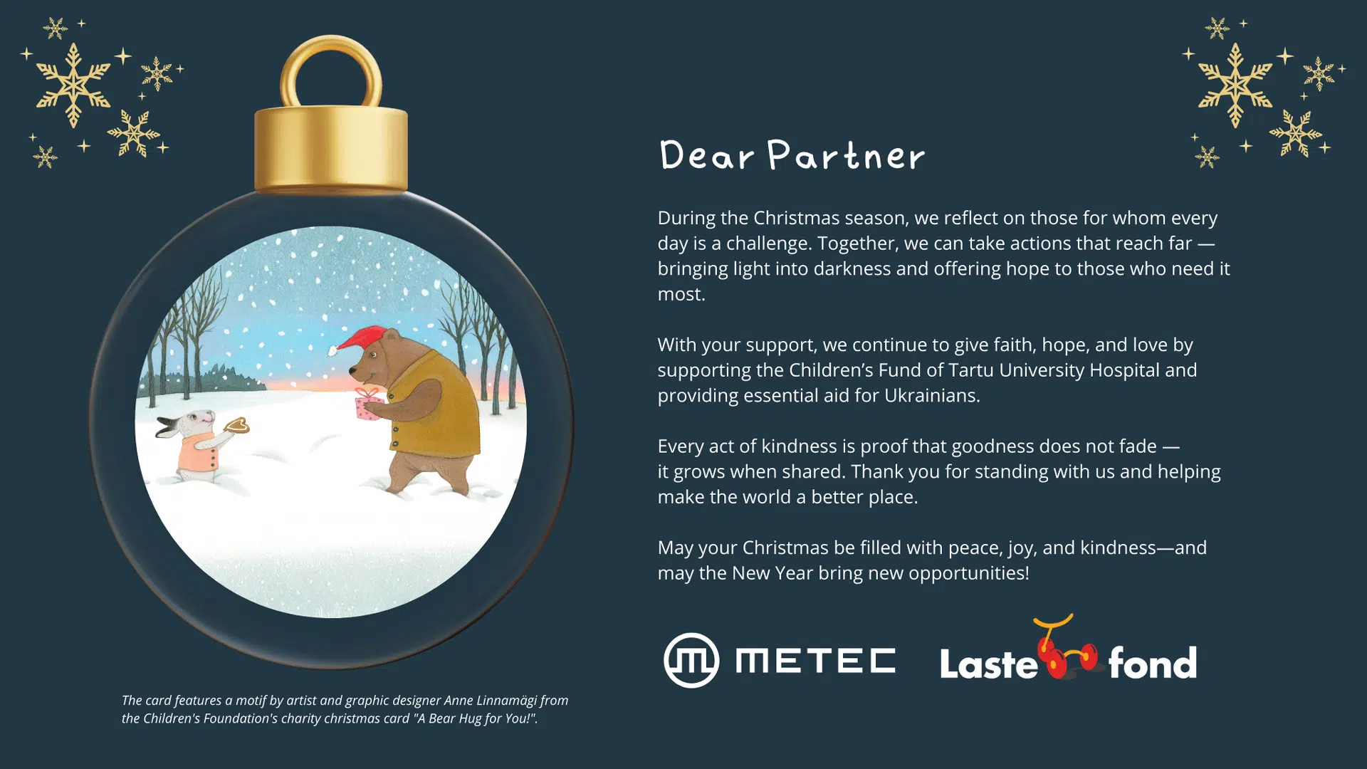 Once again, we are proud to support the Tartu University Hospital Children’s Foundation, helping to fund treatment, care, and essential medical aids for children with severe or rare illnesses across Estonia. Over its 24 years of activity, the Children’s Foundation has raised nearly €26 million in donations and supported approximately 5,000 children, guided by the principle that every child matters.